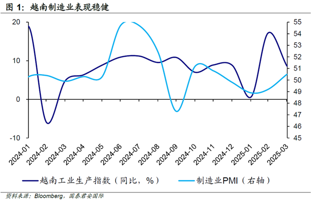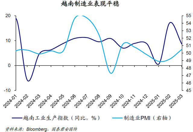 特朗普再次上任已经100天有余,这期间全球重大局势基本都围绕其展开。这对世界而言是一个极其重要的转折点,全球主要大国纷纷调整战略以重新定义其在全球舞台的角色。越南政府也积极响应,我们相信,越南2025年的发展将塑造并开启越南未来几十年的全新时代。 2025年第一季度,越南GDP增速高达6.9%,这是近六年来同期最高水平。考虑到季节性因素,这为越南政府制定的全年实现8.0%增速目标打下了良好的基础。 受农历新年影响,2025年前两个月越南工业生产存在少许波动,但3月终于恢复稳定。2025年3月越南工业生产指数(IIP)同比增长7.8%。制造业(+9.5%)以及供水和废物处理(+11.6%)领跑整个生产活动。越南制造业PMI连续三个月下滑。不过特朗普宣布关税政策推迟90天生效,进入4月后,越南PMI再次显示出生产扩展的迹象。这表明企业端已经做出了相应的调整并且在一定程度上修复了对经济前景的信心。 在2025年前三个月,越南注册的外商直接投资(FDI)约为109.8亿美元,同比增速为34.7%。随着注册外商直接投资的大幅增长,第一季度FDI到位率也随之提高。今年前三个月,FDI实际到位金额达49.6亿美元,同比增长7.1%。FDI到位加速是确保越南2025年增长计划顺利实施的重要前提,也是为未来几年实现更高增长奠定基础的重要前提。 综上所述,越南第一季度经济表现可圈可点。然而美国方面关税政策从4月初开始实行,虽延迟90天生效,但从中期来看仍可能对越南经济带来一定压力,因此为实现全年8%经济增速目标,越南政府仍需密切关注并调整相应政策以妥善应对来自美国等外部因素的冲击。 特朗普再次上任已经100天有余,这期间全球重大局势基本都围绕其展开。特朗普靠一己之力几乎扭转了美国多年来推行的全球政策及战略,这对长期以来的全球多边关系以及贸易伙伴都产生了重大影响。此时此刻,对世界而言是一个极其重要的转折点,全球主要大国纷纷调整战略以重新定义其在全球舞台的角色。越南作为新起之秀也积极调整自己的战略定位,我们有理由相信,越南2025年的发展将塑造并开启越南未来几十年的全新时代。 越南第一季度经济交出“满分答卷” 2025年第一季度,越南GDP增速高达6.9%,这是近六年来同期最高水平。考虑到季节性因素,这为越南政府制定的全年实现8.0%增速目标打下了良好的基础。 从分项看,工业和建筑业占GDP的35%,同比增速7.4%。虽然占比略低于2024年的36.5%,但整体增长势头良好。制造业是工业的主要组成部分,占工业的比重达到66.1%,同比增速9.3%,继续保持强劲发展势头。农业占比为10.2%,较2024年的10.4%小幅下降。农业板块第一季度增速录得3.74%,预计未来这一占比还将继续降低,但农业仍然是保障国家粮食安全的重要基础。服务业GDP比重为45.3%,增速最快,录得7.7%。 总体来看,越南经济在第一季度保持了良好增长,各行业继续向现代化转型。不可否认的是,越南经济对外依存度较高,2024年进出口总额占GDP的165%,全球贸易波动可能对越南造成较大冲击,特别是美国政策变化可能带来较大影响,越南要实现全年8%的增长目标仍面临挑战。不过,如果政府能有效实施经济刺激政策并妥善应对风险,今年仍有希望实现增长目标。 3月越南工业生产活动稳健增长 受农历新年影响,2025年前两个月越南工业生产存在少许波动,但3月终于恢复稳定。2025年3月越南工业生产指数(IIP)同比增长7.8%。制造业(+9.5%)以及供水和废物处理(+11.6%)领跑整个生产活动;然而随着越南逐步摆脱资源密集型产业,采矿业出现下滑,同比下降4.7%。