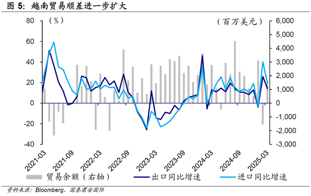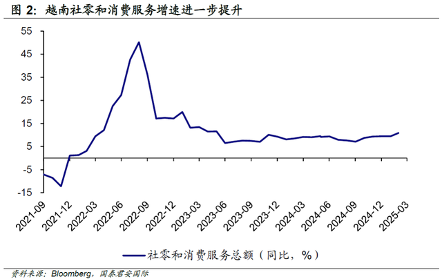 在特朗普上台并对外贸政策进行大刀阔斧改革后,越南制造业PMI连续三个月下滑。不过特朗普宣布关税政策推迟90天生效,进入4月后,越南PMI再次显示出生产扩张的迹象。这表明企业端已经做出了相应的调整并且在一定程度上修复了对经济前景的信心。 3月,越南商品和服务零售总额继续呈现高速上行态势。2025年3月,越南商品和服务零售总额预计达到571万亿越南盾,同比增长约10.8%,较前值9.4%进一步提高。这表明经济活动和消费者支出正在稳步复苏。剔除通货膨胀因素后,商品和服务零售总额的实际增长率为7.5%,高于近几个月6.2%至6.4%的平均水平。 按分项看,商品零售额占总零售额比重为76.1%,同比增长9.2%;此外,住宿和餐饮服务占总零售额的11.5%,同比增速录得12.7%;旅游服务业3月份增长强劲,达25.1%,是所有零售活动中增速最高水平;住宿和餐饮服务业也实现了16.4%的增长。
